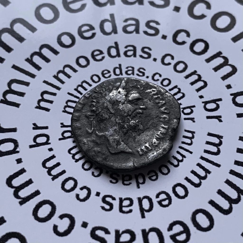 Roma, com capacete, drapeado, sentada à esquerda, segurando a Vitória na mão direita estendida e um parazónio na mão esquerda.