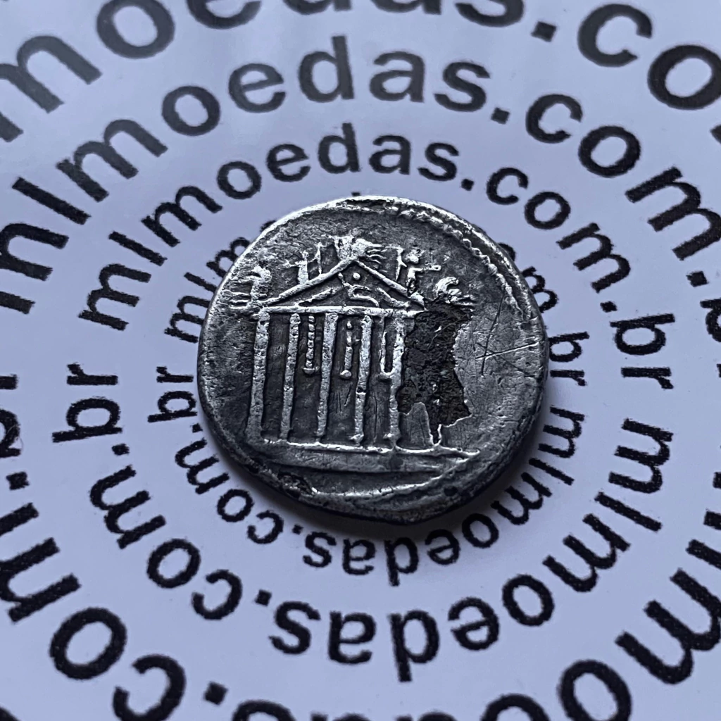 Templo de estilo hexagonal (templo Capitolino), telhado decorado com biga de cada lado e quadriga no vértice; de cada lado do vértice, figura armada; no frontão, figura incerta; entre as quatro colunas centrais, decorações suspensas.