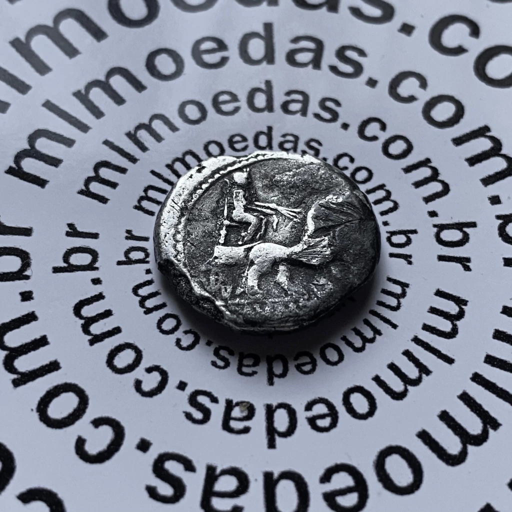 Cibele, com coroa torreada e véu, sentada numa biga de leões à direita, segurando rédeas na mão esquerda e uma patera na mão direita; acima, uma letra de controlo grega ou um número.
